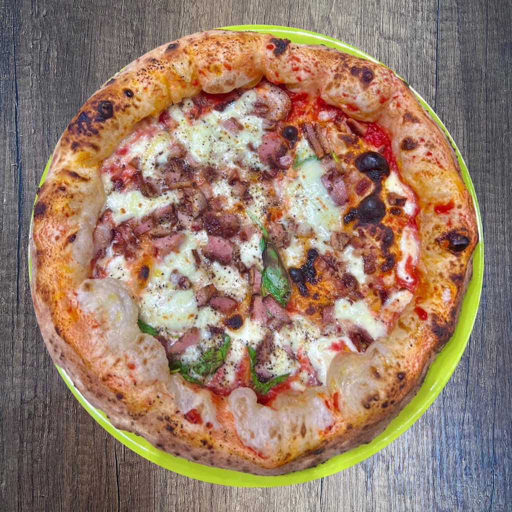 Pomodoro pelato, parmigiano grattugiato, prosciutto cotto, salame napoli, funghi champignon, olive, carciofini, fior di latte, basilico e olio evo
